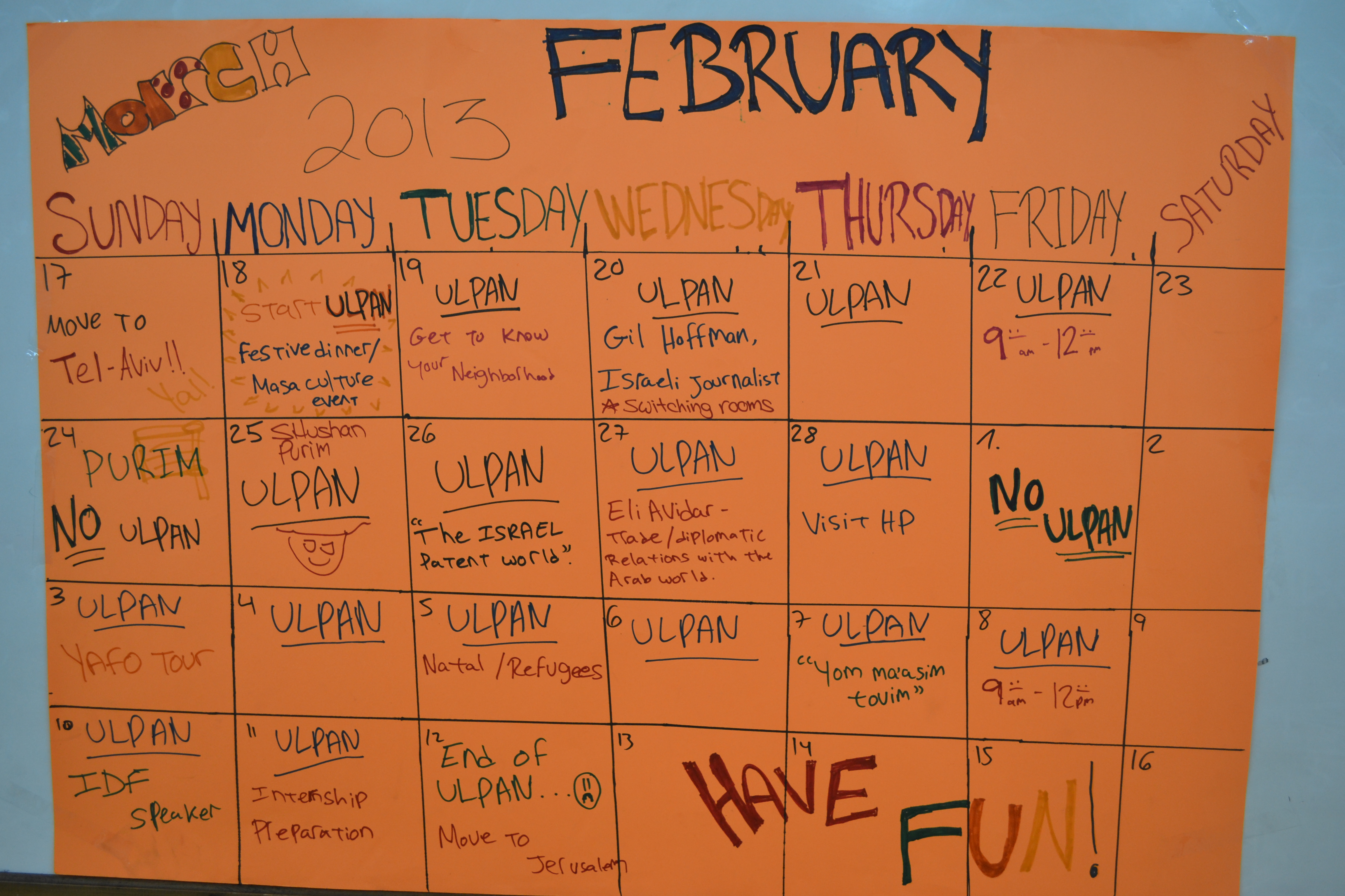 Hebrew Ulpan (Hebrew studies) will be taking place in the respective location of each participant (Tel Aviv, Jerusalem or Haifa) once a week in the evening
